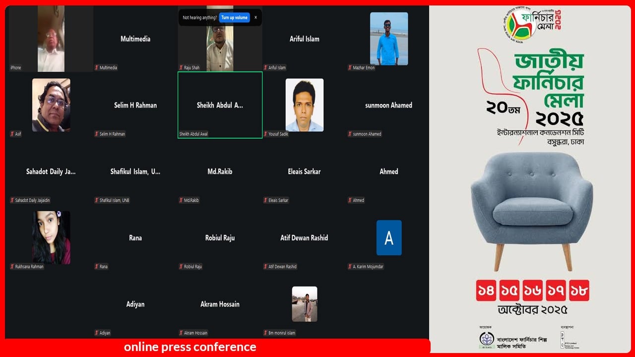 আজ বৃহস্পতিবার (০৯ অক্টোবর) ভার্চ্যুয়াল প্রেস ব্রিফিংয়ের আয়োজন করে বাংলাদেশ ফার্নিচার শিল্প মালিক সমিতি (বিএফএসএমএস)। এসময় ২০তম জাতীয় ফার্নিচার মেলার বিস্তারিত তুলে ধরেন আয়োজক কমিটির আহ্বায়ক ও বিএফএসএমএস ‘র ভাইস চেয়ারম্যান শেখ আব্দুল আউয়াল।